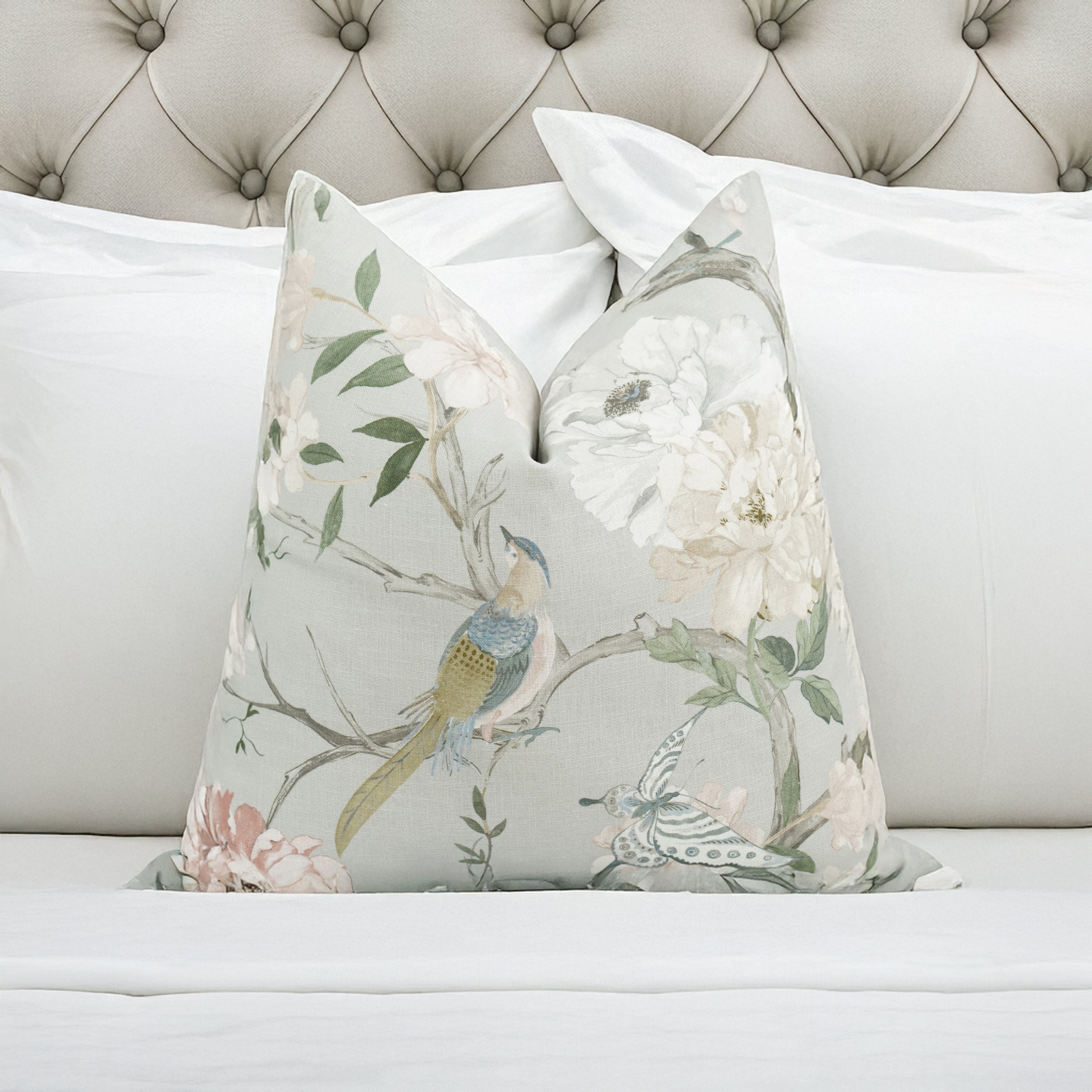 Enhance your living environment with the gorgeous Highland Sea Salt Floral & Bird Pillow. This stunning pillow features a stunning bird and floral pattern in the shades of fern green, almost white, sand, bluebell, taupe, and light rose against a Sea Salt backdrop. Bring a touch of natural elegance to your home now.