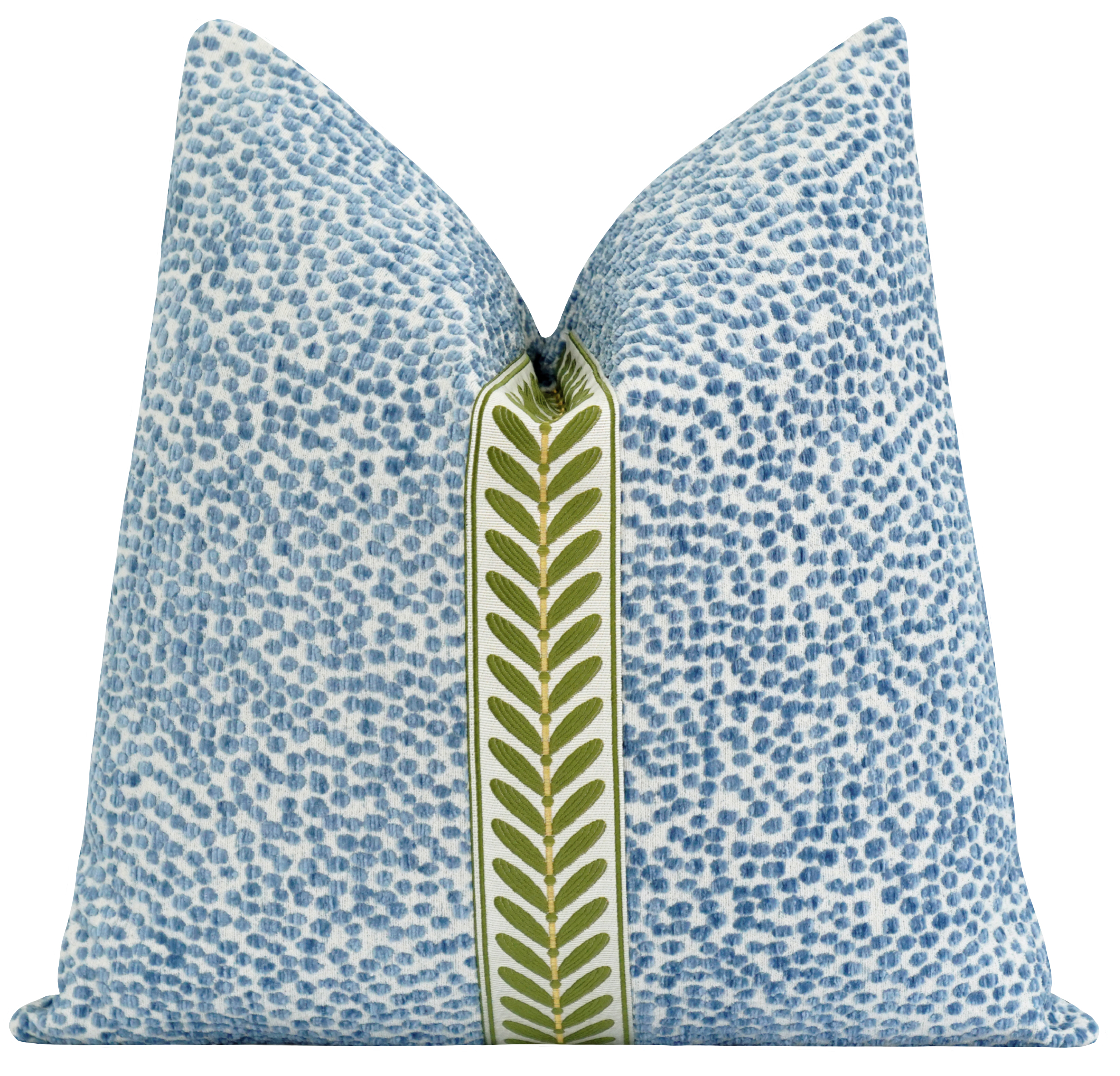 Bring tailored softness and refined texture to your space with the Blue Dotted Chenille Pillow Cover. This elegant accent features a serene blue chenille base with a delicate dotted pattern, finished with a graceful green leaf trim for a subtle botanical touch. With its calming color palette and polished detailing, this pillow offers an effortless blend of comfort and timeless style.