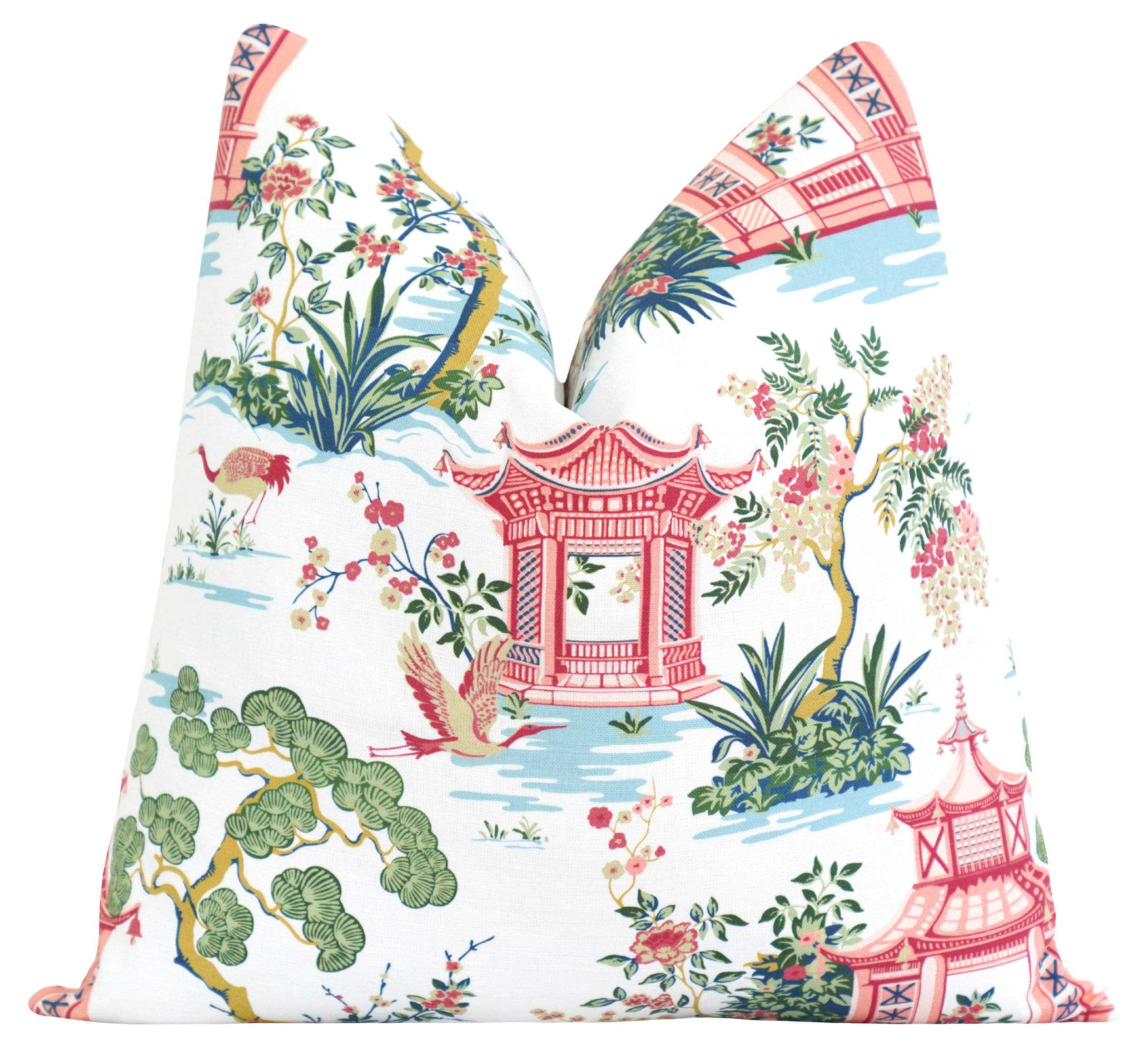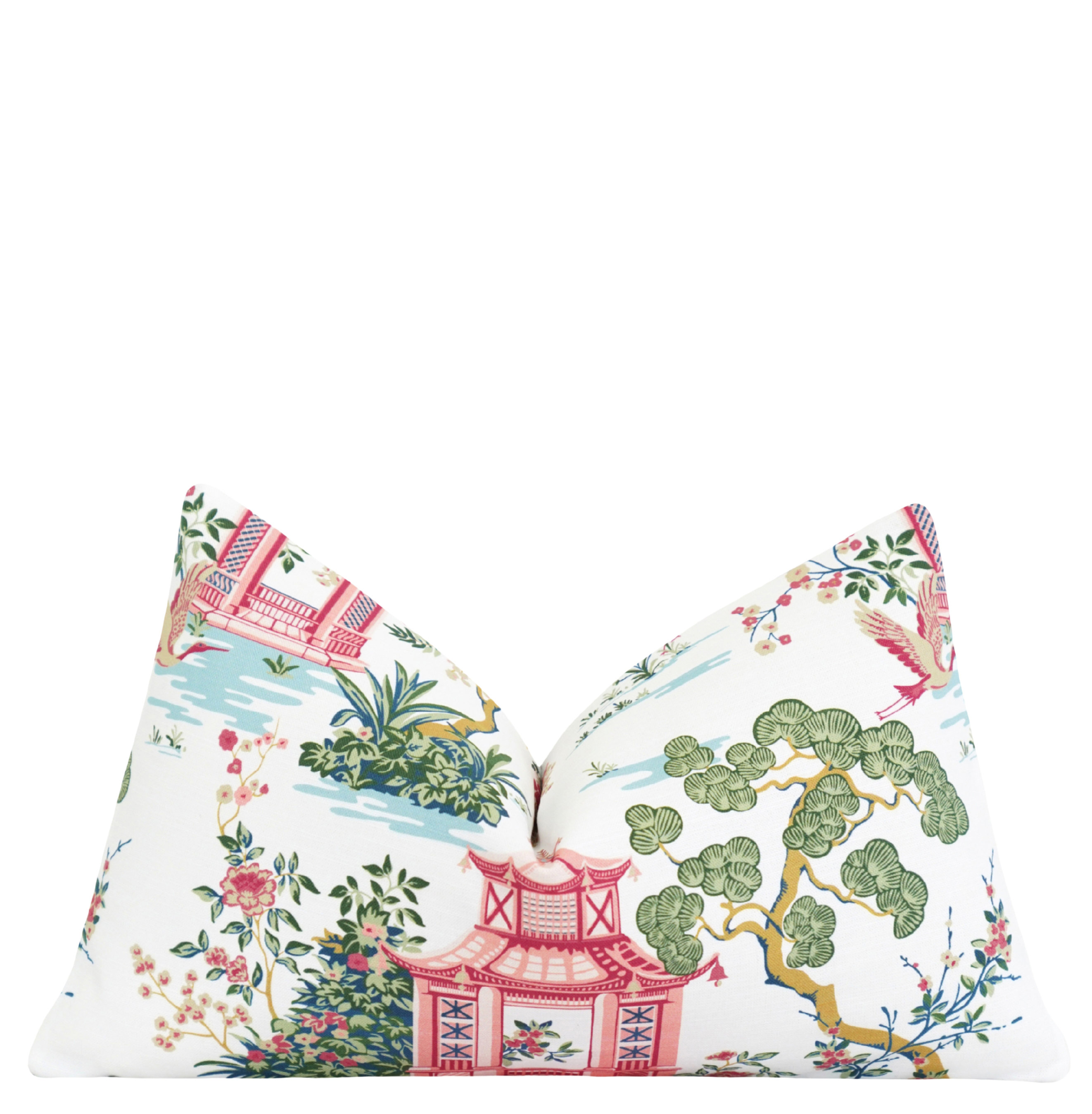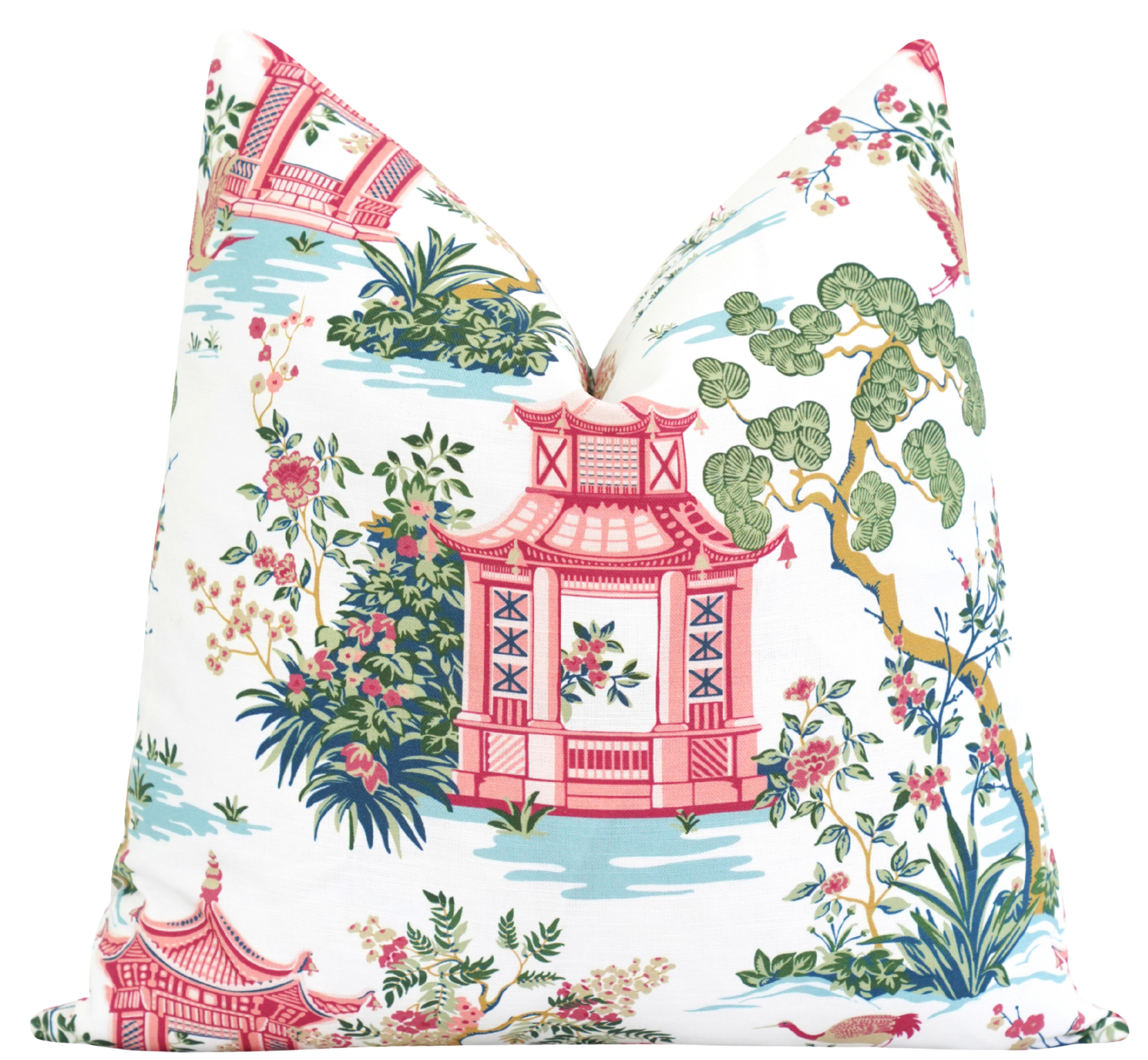Bring timeless elegance and artistic charm to your home with the Rizhao Garden Scenic Pillow Cover. This refined accent features a detailed chinoiserie-inspired landscape with coral pagodas, soft aqua waterways, and lush green botanicals set against a crisp white background. The delicate balance of color and intricate illustration creates a sophisticated, storybook feel that adds both visual interest and graceful movement to your space. Perfect for layering on sofas, beds, or accent chairs, the Rizhao pillow introduces a polished, collected look suited for classic, coastal, and transitional interiors.